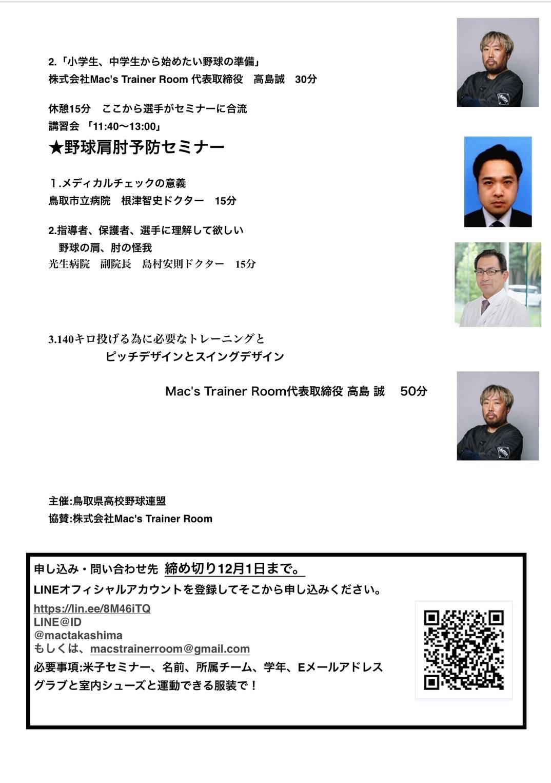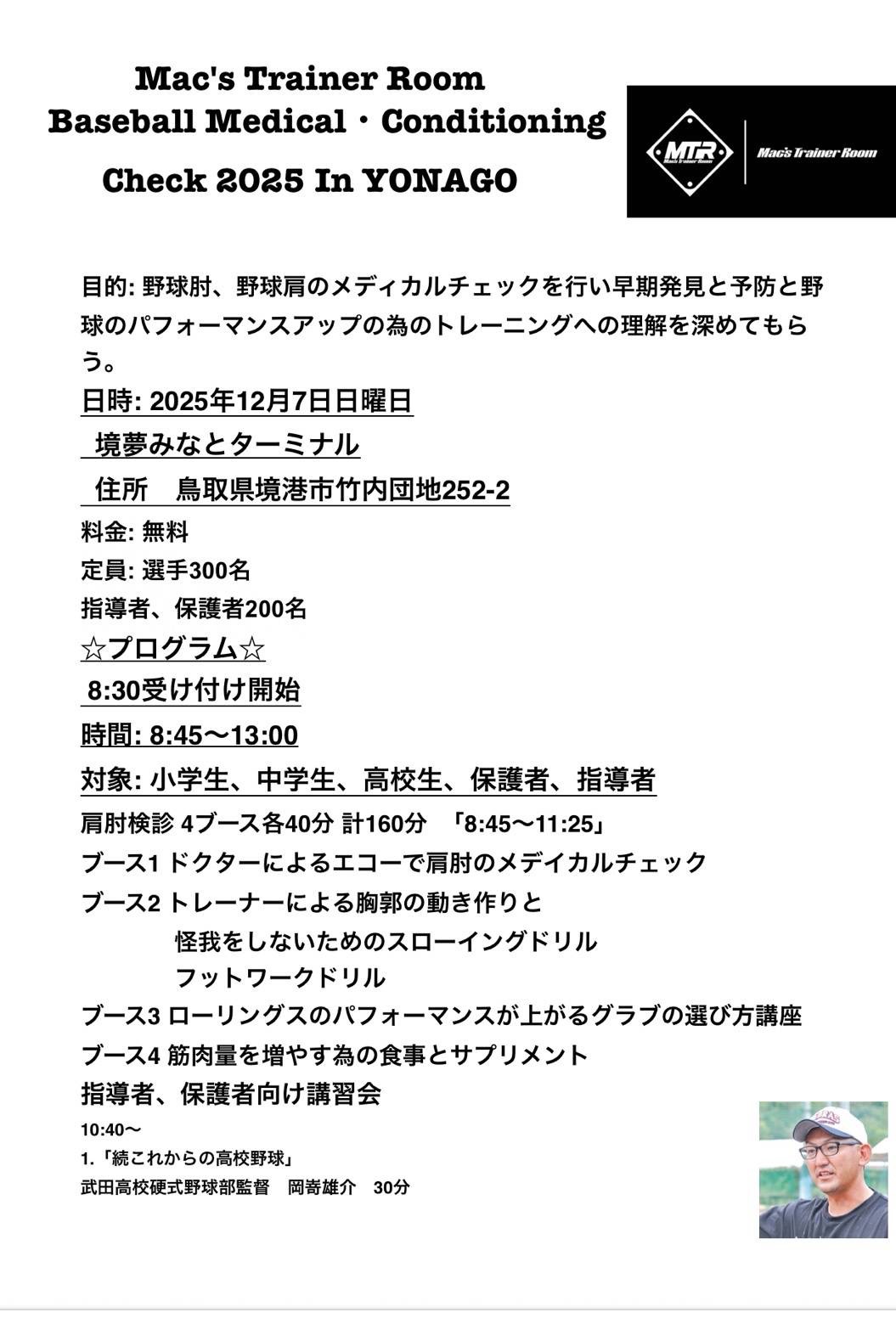 「高校野球200年構想」事業の一環として2025年12月7日(日)、境夢みなとターミナルを会場に小・中・高校生、保護者、指導者を対象とした野球肘・野球肩のメディカルチェックを行い、早期発見と予防と野球のパフォーマンスアップの為のトレーニングへの理解を深めてもらうことを目的に講習会が開催されます。